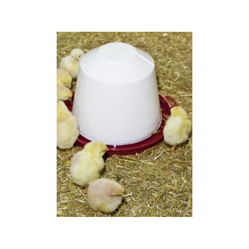 Abbeveratoio sifone realizzato in materiale plastico, formato da due parti distinte: il cono (serbatoio bianco) ed il fondo (piatto rosso). Il caricamento dell'acqua avviene capovolgendo il serbatoio, il quale grazie a dei fori presenti sul bordo evita la fuoriuscita dell'acqua. L'utilizzo è previsto appoggiando l'abbeveratoio a terra. Adatto a pulcini e gallinacei in genere.