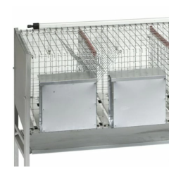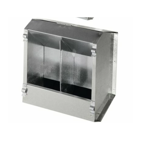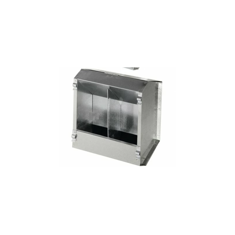 Mangiatoia per conigli con 1 e 2 scomparti in lamiera con coperchio, si agganciano esternamente alla gabbie, il coperchio è utile in quanto protegge il mangime contenuto nella mangiatoia.