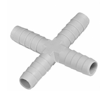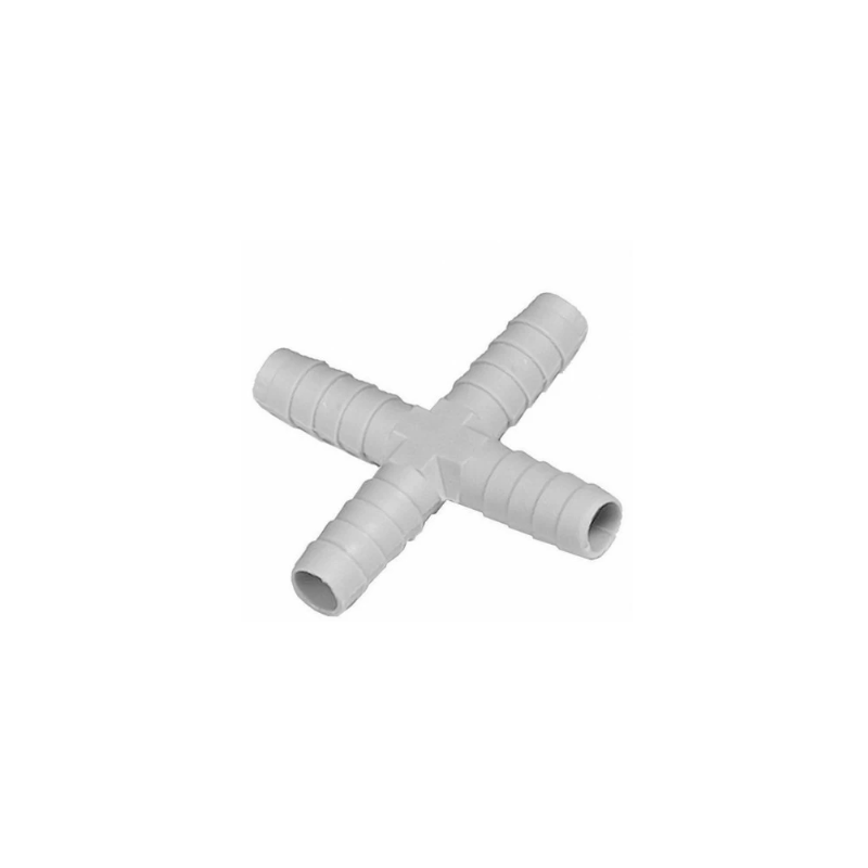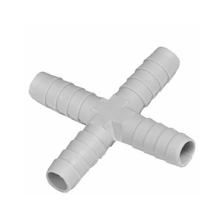 Raccordo a croce in materiale plastico, mm 10. Utile per il collegamento idrico degli abbeveratoi.
