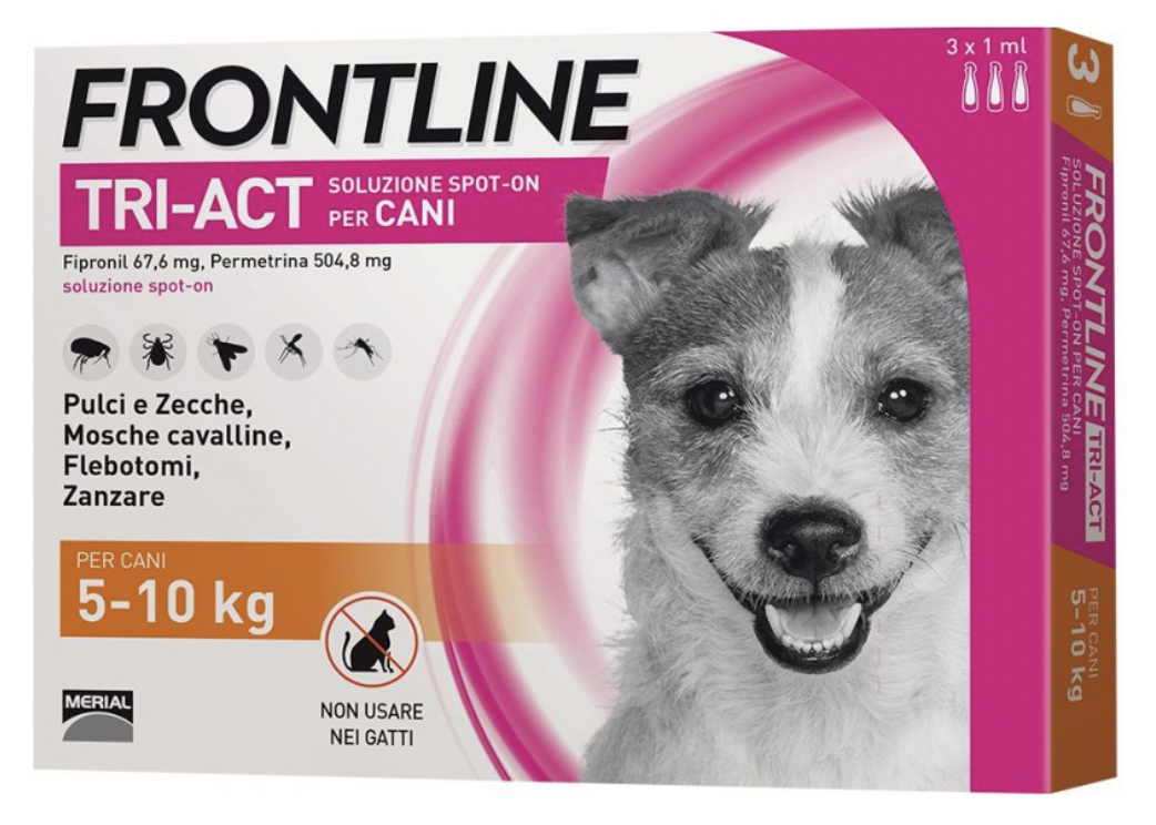Frontline Tri-Act® è una soluzione spot on repellente, insetticida e acaricida per il cane. Grazie ai suoi principi attivi, Fipronil e Permetrina, è un prodotto mirato per il trattamento e la prevenzione di infestazioni da pulci e zecche, ed è repellente contro pappataci, zanzare, zecche e mosche cavalline.
