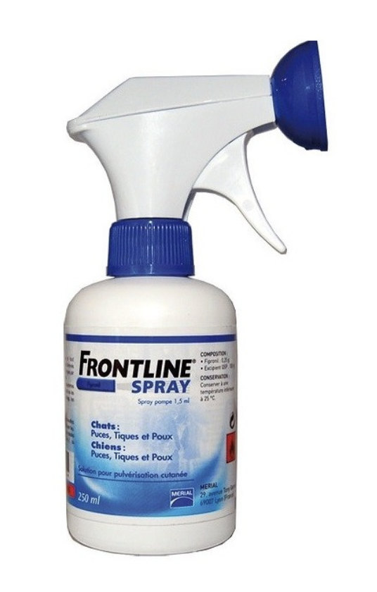 Frontline spray è un antiparassitario contente Fipronil per la prevenzione e per il trattamento delle infestazioni da pulci, zecche e pidocchi. Il prodotto è adatto sia per cani che per gatti e svolge un azione antiparassitaria che varia da 3 a 6 settimane per le zecche e da 1 a 3 mesi nei confronti delle pulci.