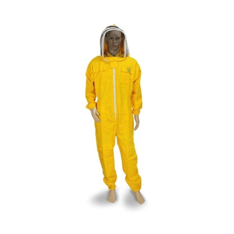 Tuta intera in tela di cotone giallo, completa di maschera , aerata e ideata per un lavoro prolungato in apiario in tutta sicurezza . Una protezione efficace dalle punture è consentita anche dagli elastici alle caviglie e ai polsi che permettono alla tuta di aderire bene al corpo.