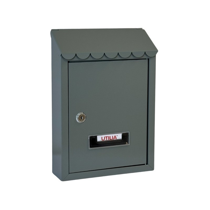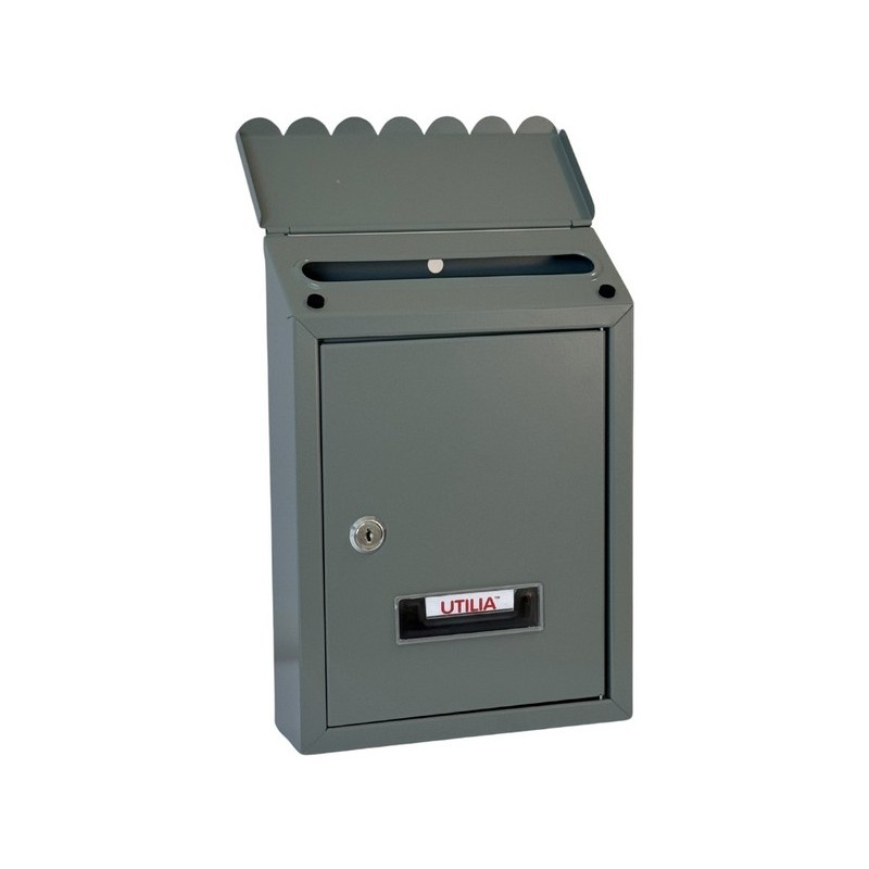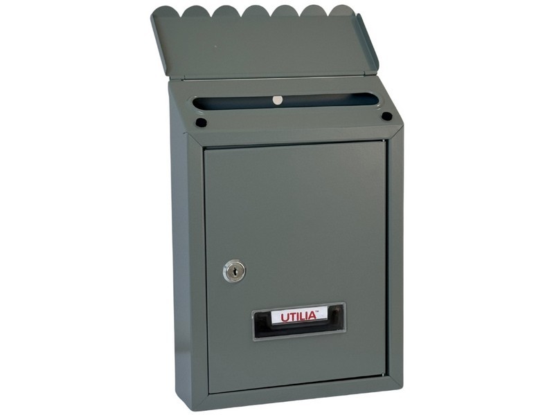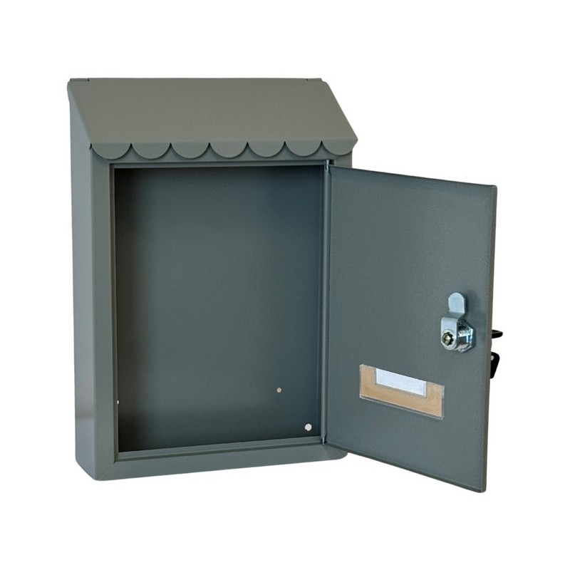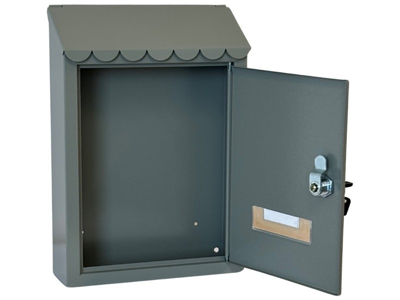 In lamiera verniciata. Feritoia superiore, tetto, serratura a cilindro con 2 chiavi, mm. 210x60x300 h.