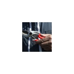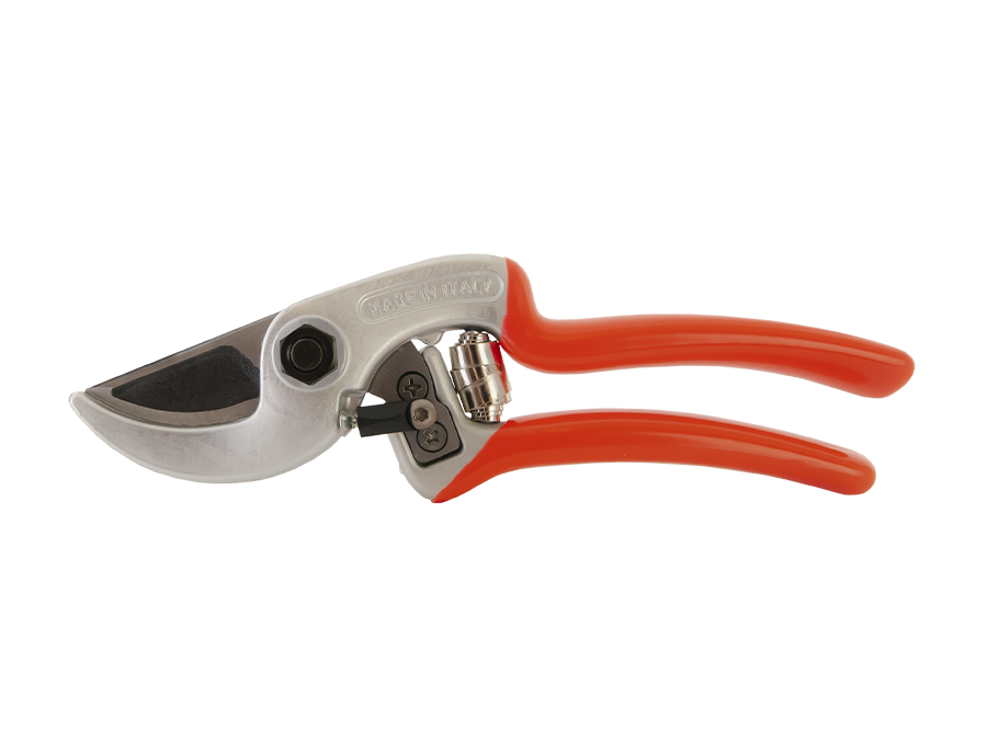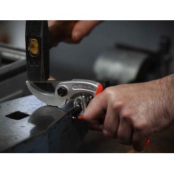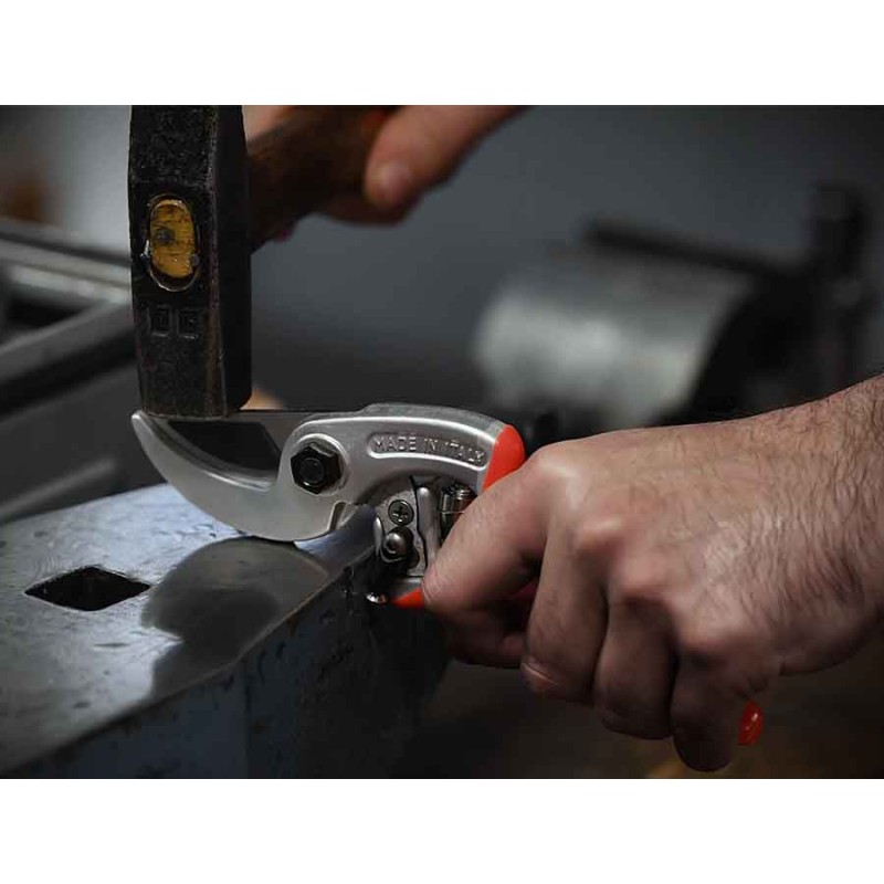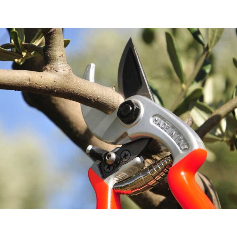 Forbice professionale con battuta curva che permette di trattenere fermo il ramo in fase di taglio evitando il contraccolpo sul polso. L’impugnatura è di tipo universale adatta a destri e mancini. Il manico e la contro-lama in lega di alluminio leggero sono forgiati a caldo, il trattamento superficiale con ossidazione anodica permette una maggiore resistenza nel tempo. La lama in acciaio con alta percentuale di carbonio è forgiata a caldo. L’incavo nella lama diminuisce lo sforzo necessario al taglio perchè aumenta la penetrazione nel ramo. Come tutti gli utensili per la potatura manuale, è completamente intercambiabile e regolabile.