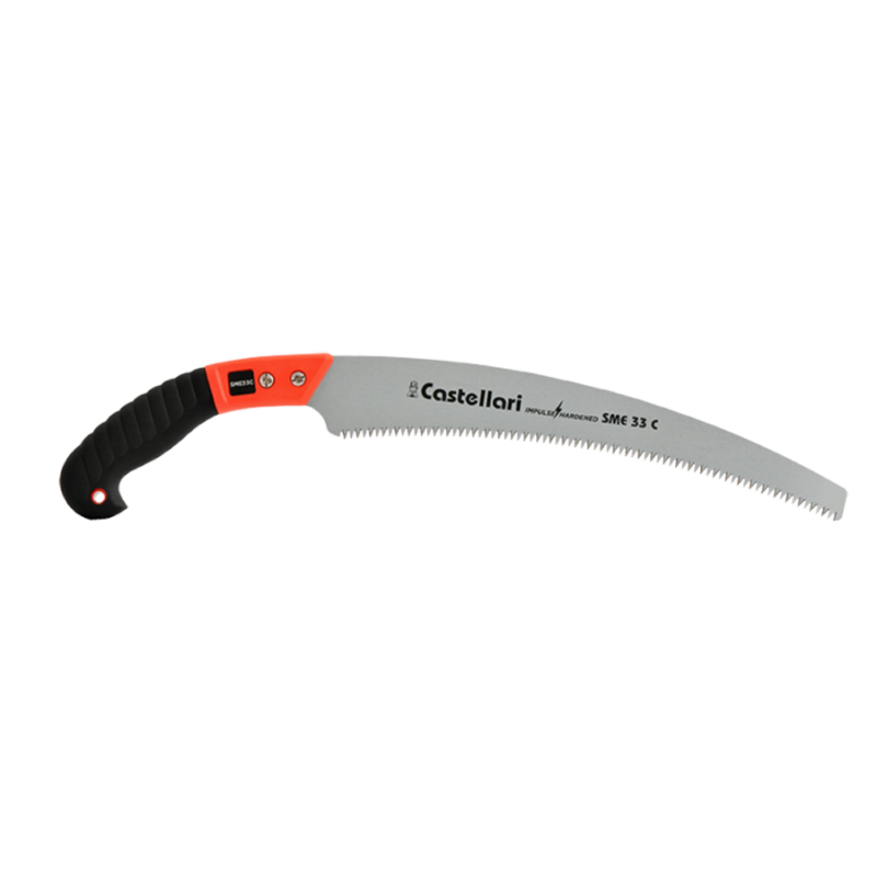 Il seghetto professionale SME 33C è caratterizzato dalla forma curva della sua lama. La lama è in acciaio ad alto contenuto di carbonio con ricopertura al cromo duro per aumentare la penetrazione nel ramo e come trattamento anti-ruggine. Il taglio netto e preciso rende la superficie del legno liscia e levigata, questo evita infezioni e consente una rapida cicatrizzazione del ramo. I denti sono affilati su 3 piani e con tempra ad impulsi per prolungare al massimo la durata dell’affilatura. La particolare lavorazione della lama detta “a piani svasati” è studiata per migliorare la penetrazione nel ramo diminuendo radicalmente l’attrito. È munito di fodero con fibbia orientabile.