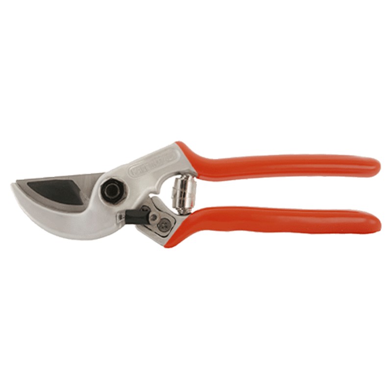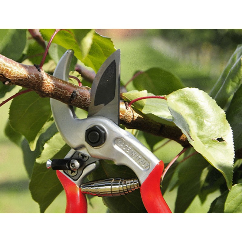 Forbice professionale con battuta curva che permette di trattenere fermo il ramo in fase di taglio evitando il contraccolpo sul polso. L’impugnatura è di tipo universale adatta a destri e mancini. Il manico e la contro-lama in lega di alluminio leggero sono forgiati a caldo, il trattamento superficiale con ossidazione anodica permette una maggiore resistenza nel tempo. La lama in acciaio con alta percentuale di carbonio è forgiata a caldo. L’incavo nella lama diminuisce lo sforzo necessario al taglio perchè aumenta la penetrazione nel ramo. Come tutti gli utensili per la potatura manuale, è completamente intercambiabile e regolabile.
