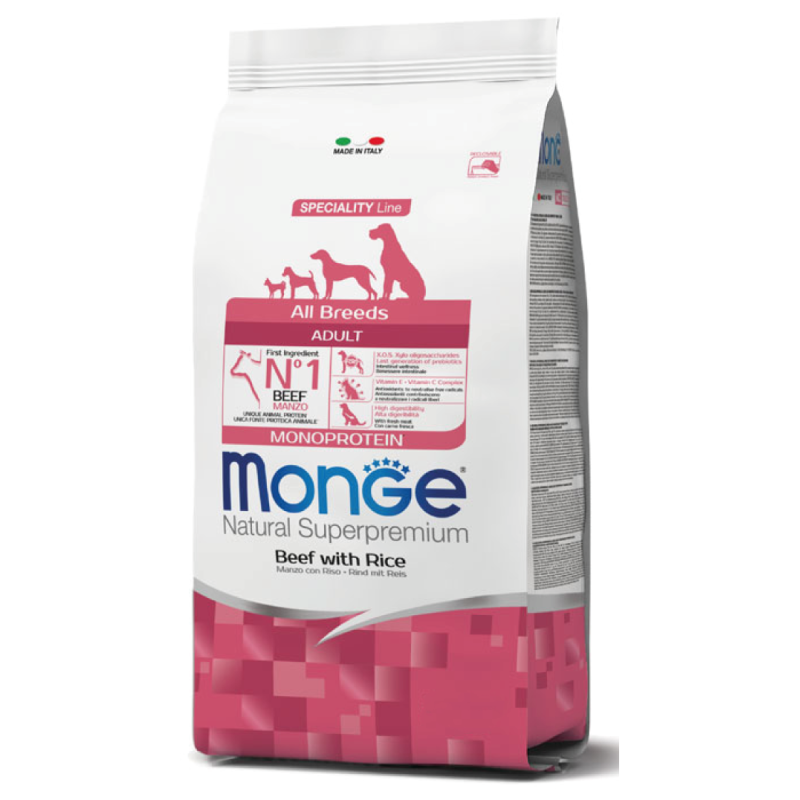 Monge Natural Superpremium All breeds Adult Monoprotein* Manzo con Riso è un alimento completo per cani adulti di tutte le taglie.