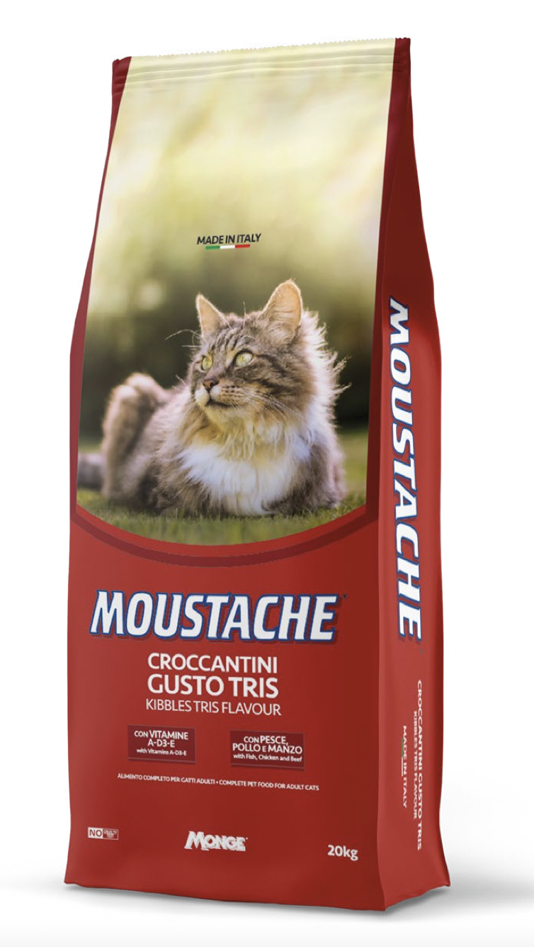 MOUSTACHE GATTO ADULTO CROCCANTINI GUSTO TRIS è un alimento completo e bilanciato per gatti adulti. Una ricetta gustosa con pesce, pollo e manzo e addizionata in vitamine A-D3-E per il supporto del benessere fisiologico dell’animale. La formulazione è arricchita con Taurina, un aminoacido essenziale che contribuisce alla buona funzionalità cardiaca e visiva del gatto. Senza conservanti artificiali aggiunti.