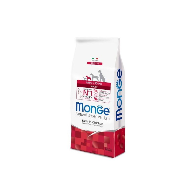 Monge Natural Superpremium Mini Adult Ricco in Pollo è un alimento completo per cani adulti di taglia mini (<10 kg). Specificamente sviluppato pensando al benessere del tuo cane, grazie alla presenza di sostanze nutritive di qualità frutto della ricerca Made in Italy. Il primo ingrediente è il pollo e la formulazione è caratterizzata da digeribilità e appetibilità grazie all’inclusione di carne fresca. La ricetta è arricchita con prebiotici di ultima generazione xilo-oligosaccaridi (XOS) per il supporto del benessere intestinale. La formulazione contiene inoltre L-carnitina per il supporto del peso corporeo ideale e un rapporto ottimale omega-6/omega-3 per il mantenimento della lucentezza del pelo, grazie alla presenza di olio di salmone. Senza coloranti e conservanti artificiali aggiunti.