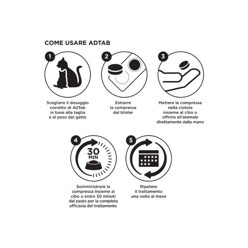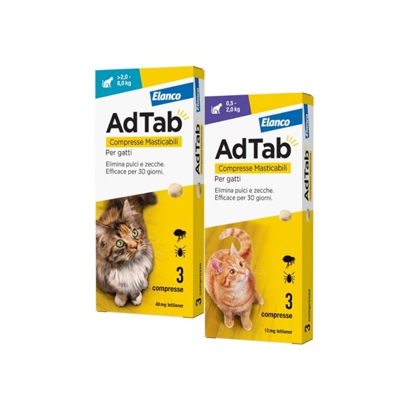 - Ogni confezione di AdTab per gatti contiene tre compresse masticabili mensili. Una confezione, quindi, fornisce tre mesi di somministrazione.