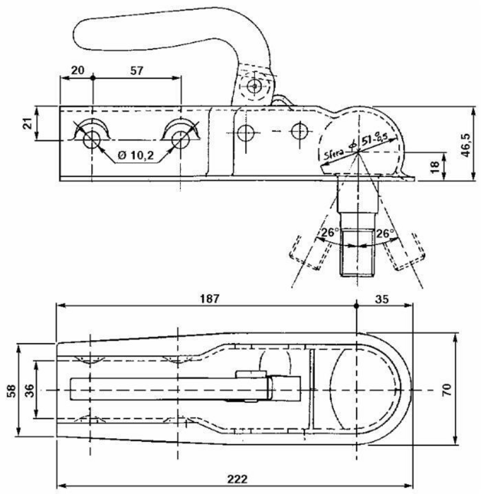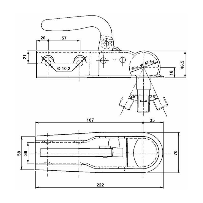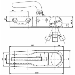 Testina per aggancio traino con attacco posteriore sferico Ø 35 mm. Massa complessiva trainabile 1000 Kg. Attacco anteriore Ø 50mm. Omologazione E3 55R-01 1001