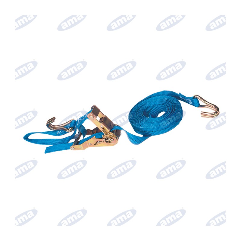 Fascia di ancoraggio in poliestere con cricchetto e ganci ad uncino. Lunga 5,5 mt, alta 25 mm, portata 750 Kg