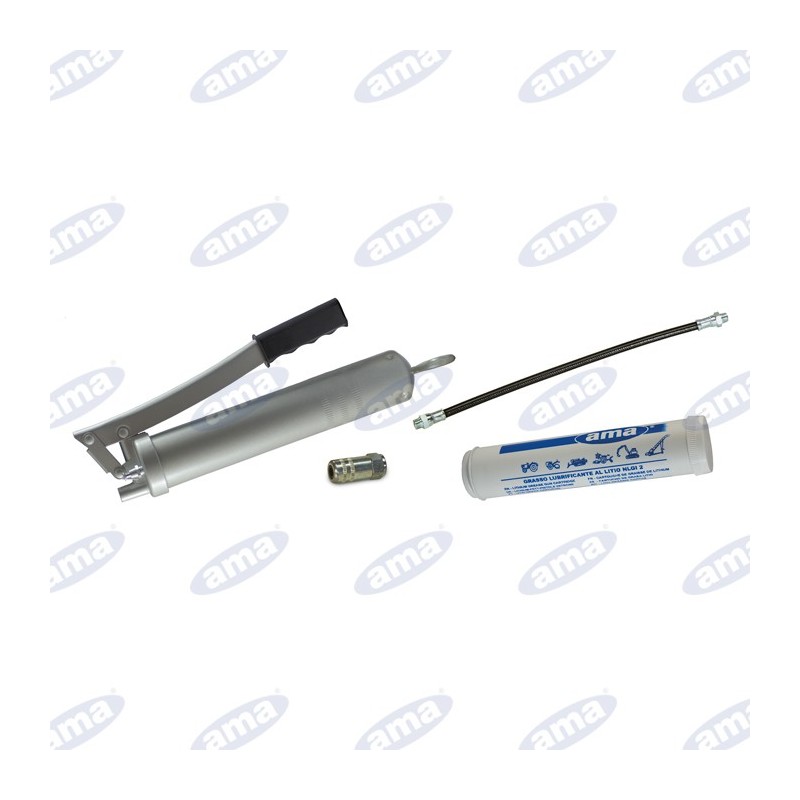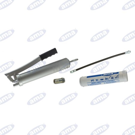 Kit per ingrassaggio in cui sono inclusi : pompa grasso 600gr , tubo flessibile 30cm , testina 4griffe standard e cartuccia grasso 600gr