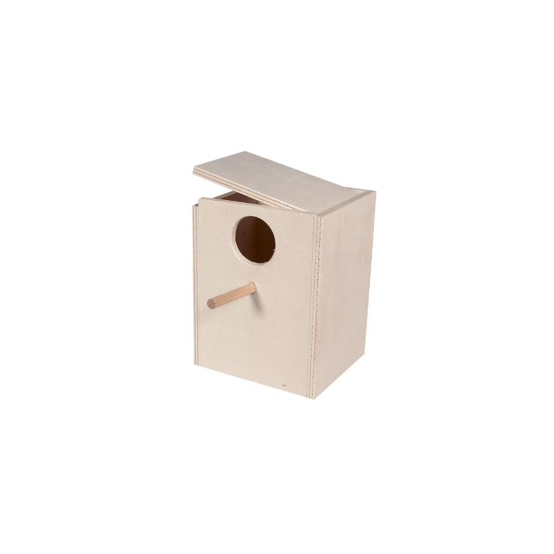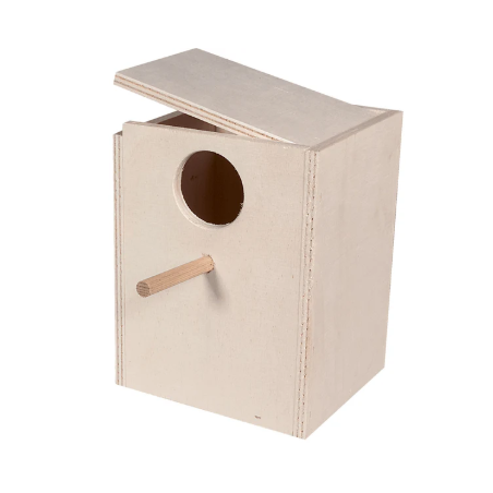 Casetta nido in legno naturale non trattato per cocorite. Dotata di tettuccio apribile e posatoio.